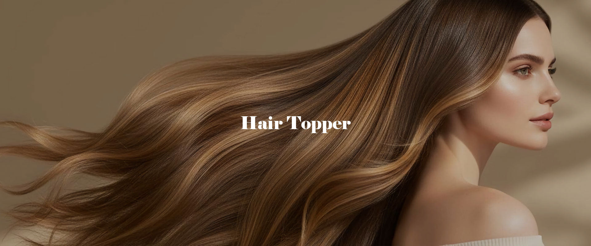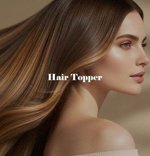 A topper is a smaller hairpiece designed to add coverage or volume to specific areas of the head, usually attached with clips.