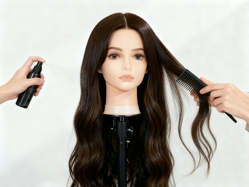 Step 5: Comb the hair from top to bottom, then place the wig on a stand, cover it with a hair net, and let it air-dry naturally indoors until 90% dry.