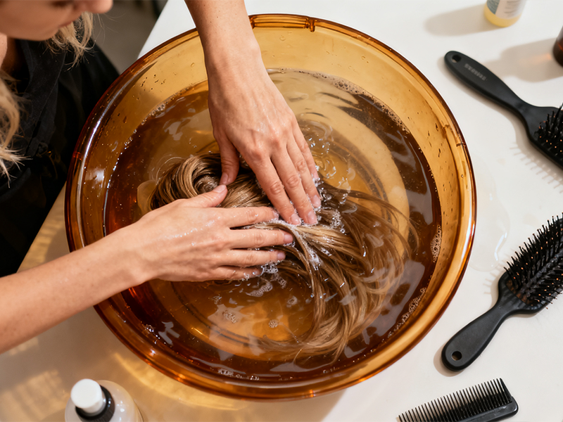 Step 1: Gently comb the hair, then fully soak it in warm water.