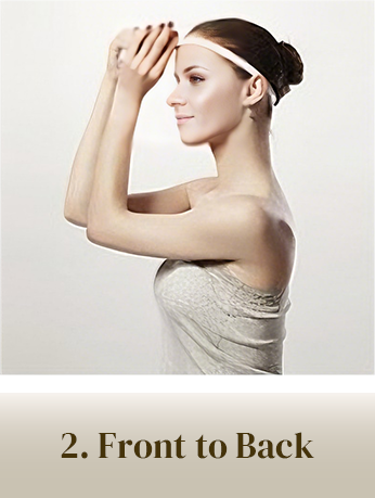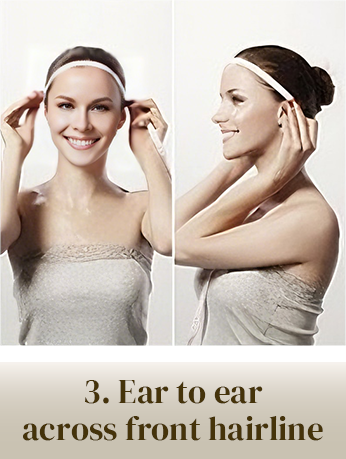 • Start at your natural hairline in the center of your forehead. Run the tape around your head, going just above your ears, following the curve at the back of your head (where it meets your neck), and back to the front.