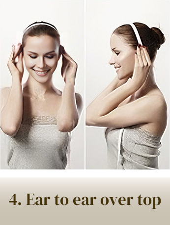 • Place the tape at the top of one ear, right where your glasses would sit if you wear them. Guide it up and over the very top of your head to the same spot on your other ear.